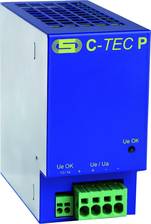 The C-TEC 2425P series DC inverter is equipped with built-in ultra-capacitors to store energy. During normal operation, this capacitor is charged by an internal charger that is powered by a regulated external DC power supply. If the DC power supply is interrupted, the energy from the ultracapacitors is released in an unregulated process (24.25 to 19 V DC). The load is fed through the buffer until the voltage is ≤ 19 V. The duration of the buffer depends on the state of charge of the capacitor and the discharge current. As an additional function, the C-TEC 2425P can supply more current for a certain time.